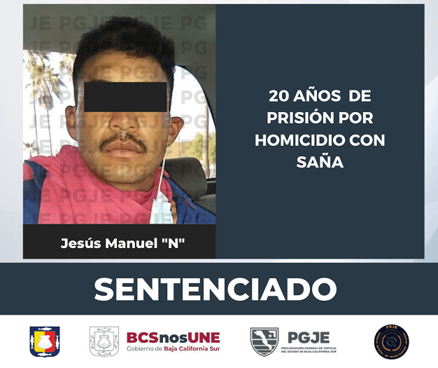 Sentencia de 20 años de prisión obtuvo la Procuraduría General de Justicia del Estado (PGJE), por medio de la Unidad de Investigación de Homicidio Doloso, en audiencia de Procedimiento Abreviado que se efectuó este martes 01 de febrero en el Centro de Justicia Penal de Ciudad Constitución.