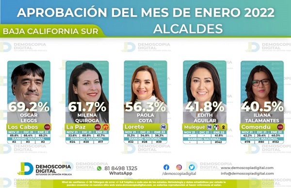 - De un total de 1,000 participantes, el presidente municipal de Los Cabos obtuvo un 69.2% de aprobación.