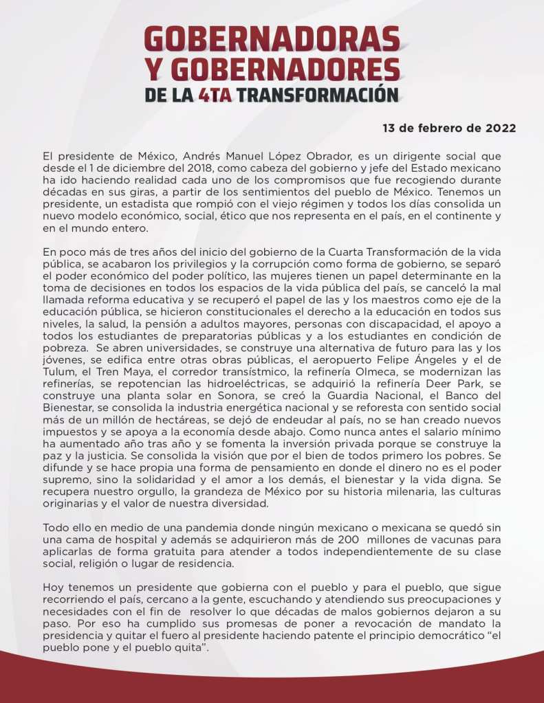 «Sabemos que los ataques tienen su origen en grupos económicos que perdieron privilegios y que se oponen a una reforma eléctrica que beneficie a la Nación y al pueblo de México. Se equivocan, el pueblo no quiere que regrese el viejo régimen, defienden con orgullo esta transformación que no tiene marcha atrás», afirmaron en una carta difundida este domingo.