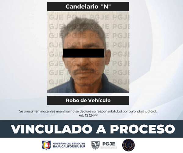 Un Juez de Control vinculó a proceso a un hombre identificado como Candelario “N” por el delito de robo equiparado de vehículo de motor, por hechos ocurridos en la ciudad de San José del Cabo.