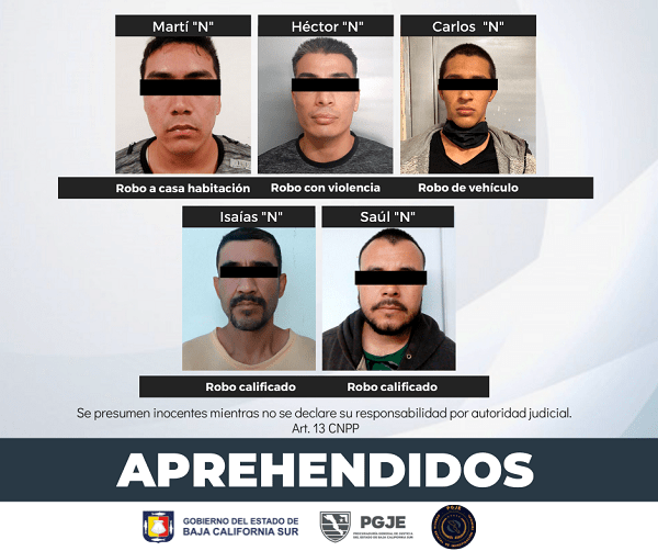 Por su probable responsabilidad en la comisión de hechos delictivos, la Procuraduría General de Justicia del Estado (PGJE) de Baja California Sur aseguró a cinco hombres, en distintas acciones de aplicación de la justicia.