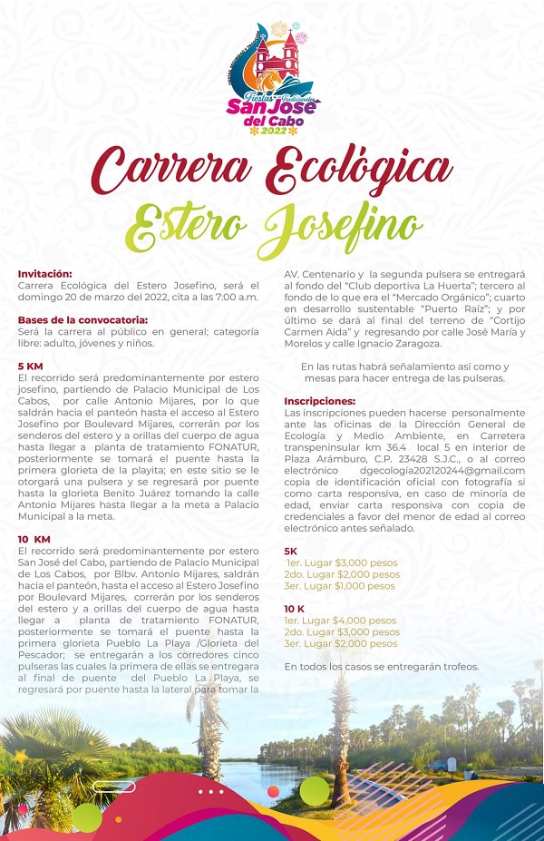 Se comunica a la ciudadanía que el próximo domingo 20 de marzo, se realizará la “Carrera Ecológica Estero Josefino”, como parte de las actividades que integran las Fiestas Tradicionales San José del Cabo 2022.