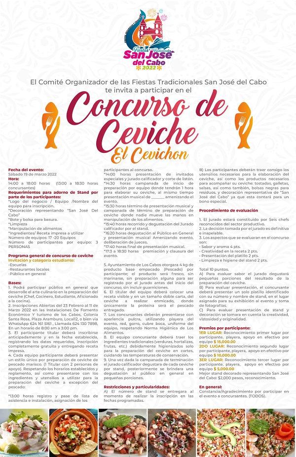 El Comité Organizador de las Fiestas Tradicionales San José del Cabo 2022, informa a la población que este 19 de marzo se realizará el Concurso de Ceviche ‘‘El Cevichón’’.