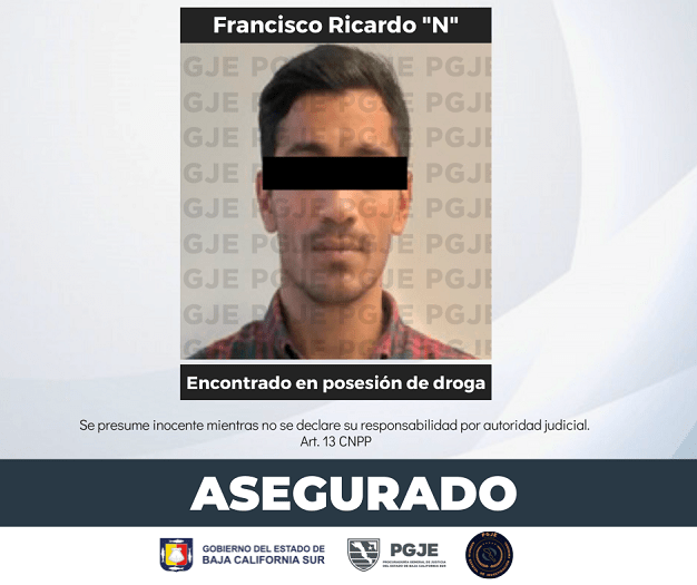 Personal de la Procuraduría General de Justicia del Estado (PGJE) de Baja California Sur realizó aseguramiento en flagrancia de un hombre con droga en la colonia Ciudad del Cielo el mediodía del 01 de marzo.