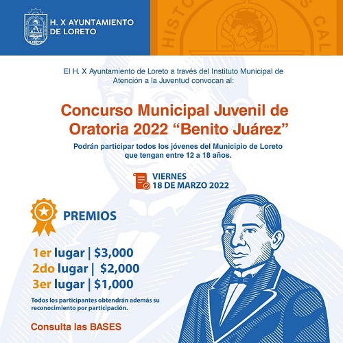 El X Ayuntamiento de Loreto, a través del Instituto Municipal de Atención a la Juventud, convocan al concurso juvenil de oratoria 2022 Benito Juárez García, para jóvenes de 12 a 18 años.