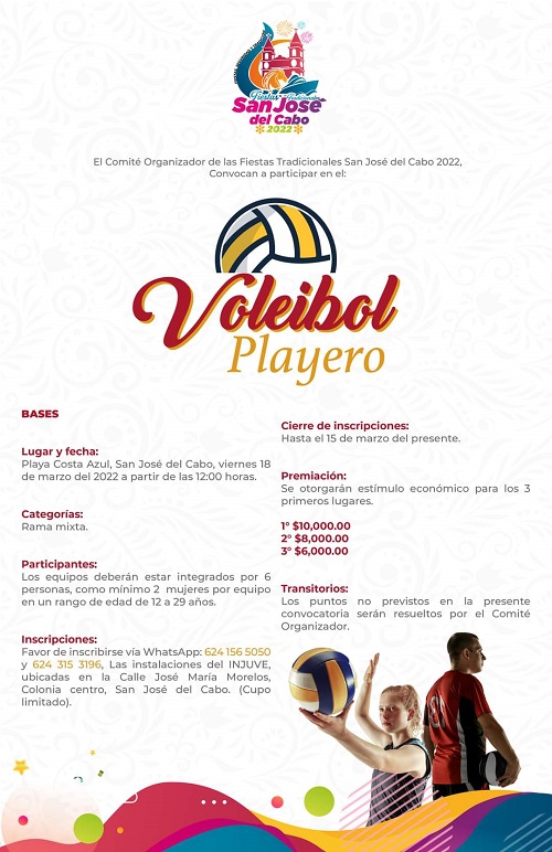 El Comité Organizador de las Fiestas Tradicionales San José del Cabo 2022, informan a la comunidad sobre el Torneo de Voleibol Playero que se llevará a cabo el viernes 18 de marzo en la playa Costa Azul, a partir de las 12:00 de la tarde.