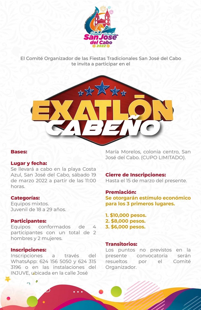 Se informa a las y los atletas que residen en el municipio de Los Cabos, que el próximo sábado 19 de marzo a las 11:00 de la mañana, -con motivo de las celebraciones de las Fiestas Tradicionales San José del Cabo 2022-, la playa Costa Azul será el escenario adaptado para llevar a cabo las competencias del Exatlón Cabeño.