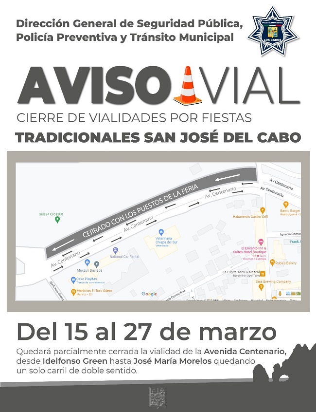El Gobierno de Los Cabos informa a la ciudadanía que en razón de los preparativos y celebración de las Fiestas Tradicionales San José del Cabo 2022, a partir de este martes 15 de marzo inicia el cierre parcial de la avenida Centenario, desde la calle Idelfonso Green hasta la calle José María Morelos.