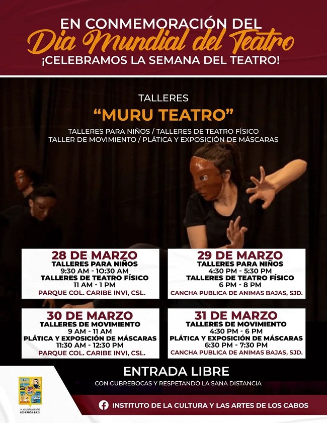 Se comunica a la comunidad del municipio de Los Cabos que, con motivo de la celebración número 61 del Día Mundial del Teatro, el Instituto de la Cultura y las Artes del Municipio de Los Cabos (ICA), realizará diversas presentaciones y talleres gratuitos del 28 de marzo al 01 de abril del año en curso.