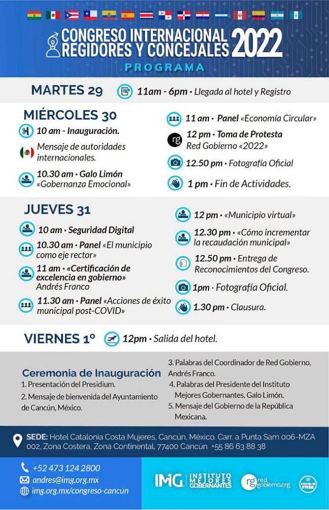 Se comunica a la ciudadanía que, del 29 de marzo al 1 de abril del presente año, la ciudad de Cancún, Quintana Roo, será la sede del Congreso Internacional de Regidores y Concejales 2022, donde integrantes del H. Cabildo de Los Cabos asistirán con la intención de adquirir y reforzar conocimientos en temas trascendentales para el óptimo crecimiento del municipio.