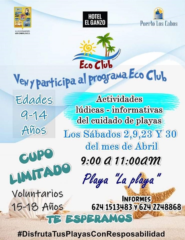 Se informa a niños, niñas y adolescentes del municipio que, el Gobierno Municipal a través de ZOFEMAT Los Cabos, estará llevando a cabo los sábados del mes de abril, -en la comunidad de La Playa, de San José del Cabo-, el proyecto de nombre Eco Club, en el cual se realizarán actividades recreativas, lúdicas e informativas sobre el cuidado de las playas.