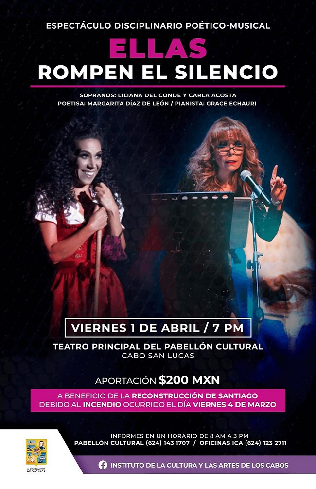 El Instituto de la Cultura y las Artes del Municipio de Los Cabos (ICA), presentará este 01 de abril a las 07:00 de la noche, el espectáculo disciplinario poético musical ‘’Ellas rompen el silencio’’, el cual tiene como objetivo recabar ayuda para las familias de la delegación de Santiago, tras ser afectadas por el voraz incendio ocurrido en aquella zona.
