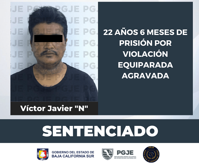Al ser presentado ante el Tribunal de Enjuiciamiento, en las audiencias de individualización de sanciones, efectuadas el 28 y 29 de marzo del año en curso en el Centro de Justicia Penal de Cabo San Lucas, el Tribunal Colegiado de Enjuiciamiento lo declaró culpable por el delito de violación equiparada agravada y le impuso, una sentencia de 22 años 6 meses de prisión y el pago de 150 días de multa.