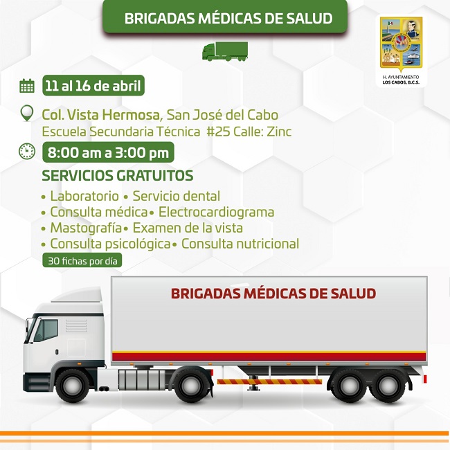 En ese sentido, se informa a la población cabeña que los servicios médicos que se ofrecen en la unidad móvil de la Brigada de Atención Médica son: consulta médica general, dental, nutricional y psicológica, así como exámenes de electrocardiograma, laboratorio, vista y mastografía para personas mayores de 35 años de edad o con antecedentes de familiares con cáncer; asimismo, se da a conocer que dicha unidad móvil se encontrará ubicada en el bulevar Villa de Cortez y esquina con la calle Rodrigo Aragón en la colonia Vista Hermosa, a un costado de la Secundaria Técnica #25.