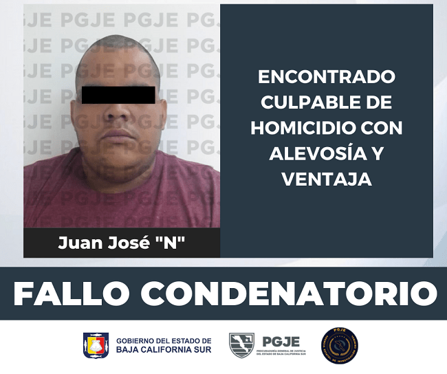 Al ser presentado ante el Tribunal de Enjuiciamiento, en la audiencia de Juicio Oral celebrada el martes 5 de abril, del año en curso, en el Centro de Justicia Penal de Cabo San lucas, el Tribunal de Enjuiciamiento lo declaró culpable por el delito de homicidio calificado con alevosía y ventaja.