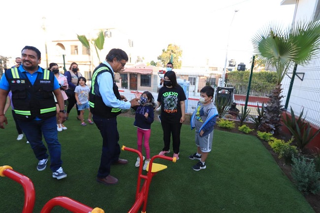 En el caso de la rehabilitación del parque, comunicó que consta de la construcción de andadores nuevos, bancas de concreto, pasto artificial, módulos de juegos infantiles, colocación de muro perimetral con rejas de acero, áreas verdes con sistema de riego automatizado, cisterna, rehabilitación de la techumbre central, iluminación con focos led para el ahorro de energía, así como juegos para personas con discapacidad.