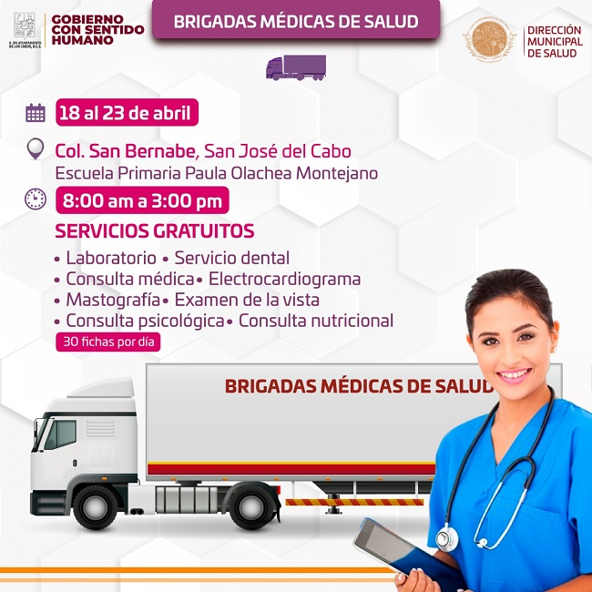 Con el objetivo de evitar la saturación de los hospitales del municipio, -al tiempo que se garantiza el bienestar y la salud de la ciudadanía cabeña-, el Gobierno de Los Cabos, a través de la Dirección Municipal de Salud, pone a disposición de los habitantes de San José del Cabo la unidad móvil de las Brigadas Médicas de Salud, la cual estará del lunes 18 al sábado 23 de abril en la colonia San Bernabé en San José del Cabo, así lo dio a conocer el director municipal de Salud, Dr. Juan Carlos Costich Perez.
