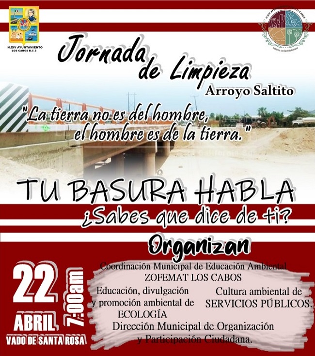 Buscando crear consciencia sobre la importancia del cuidado del planeta y los graves impactos que son causados por las personas, la Coordinación Municipal de la Zona Federal Marítimo Terrestre de Los Cabos (Zofemat), a través del área de Educación Ambiental, realizará una jornada de limpieza en el cauce del arroyo El Saltito, en San José del Cabo, esto con motivo del »Día Mundial de la Madre Tierra», a celebrarse este 22 de abril.