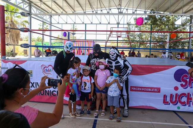 A fin de llevar alegría a la niñez cabeña en el marco del “Día del Niño y de la Niña”, -que se festeja el 30 de abril en México-, el Sistema Municipal DIF Los Cabos continúa llevando el espectáculo totalmente gratuito de lucha libre; en esta ocasión, la niñez recibió con gran entusiasmo el show que es realizado por profesionales en la materia, en la delegación de La Ribera, siendo las anfitrionas la presidenta honoraria, Flora Aguilar Murillo, junto a su homóloga, Angelica Ojeda.