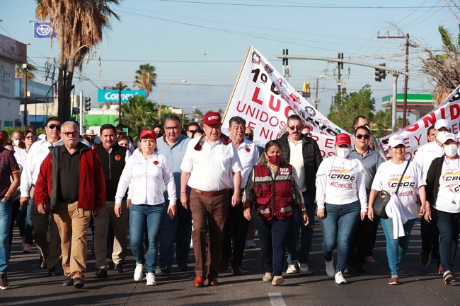 El gobernador Víctor Castro Cosío, acompañó este 1 de mayo, al contingente de representantes e integrantes de sindicatos nacionales, estatales y municipales de Baja California Sur, durante el mitin con motivo del Día del Trabajo, que inició en el parque “José María Morelos y Pavón”.