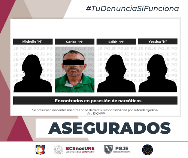 En atención a denuncias anónimas, agentes de investigación de la Procuraduría General de Justicia del Estado (PGJE) aseguraron a un hombre y tres mujeres y mil 625 dosis de narcóticos en La Paz durante operativos efectuados el lunes 13 de junio.