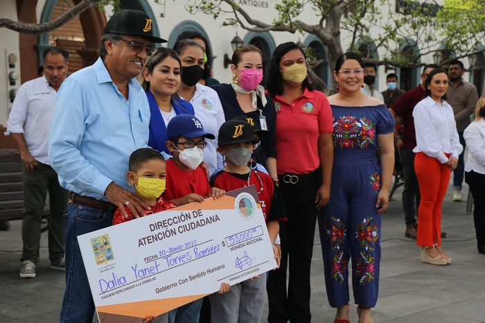 En el marco de los honores a la bandera que como cada lunes encabezan servidores públicos de la XIV Administración de Los Cabos para cumplir con su deber cívico, el alcalde Oscar Leggs Castro a través de la Dirección Municipal de Atención Ciudadana que dirige Dina Margarita de la Paz Araiza, hizo entrega de 17 computadoras portátiles a jóvenes estudiantes y un cheque por $53 mil pesos al equipo de béisbol “Diablos Rojos”, cuyos integrantes participarán en el torneo estatal de Beisbol U8 este fin de semana en Comondú.