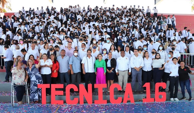 Dina Margarita de la Paz Araiza, felicitó los 548 estudiantes egresados que hoy culminan esta etapa académica, exhortándolos a continuar su preparación al contar con el respaldo de la XIV Administración: “me es grato comunicarles que para coadyuvar con los estudiantes de nuestro municipio el alcalde Oscar Leggs Castro incrementó el número de becas como una manera de ofrecerles mayores oportunidades para que sigan estudiando y cumplan sus sueños académicos; además en todo momento ha sido sensible para atender y escuchar los requerimientos del sector educativo, apoyando en la medida de lo posible diversos equipos, materiales e infraestructura”, indicó.