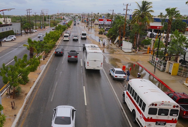 En San José del Cabo, la ruta 2 del servicio de transporte colectivo presenta interrupciones y desvío de trayectos a causa de afectaciones en las calles por los escurrimientos. Asimismo, se informa que el transporte urbano se encuentra operando únicamente con las rutas 1 y 3.