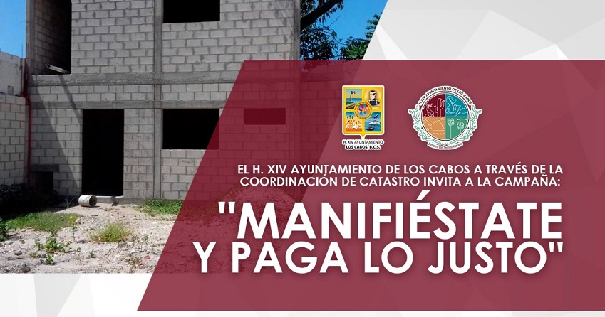 Con el propósito de apoyar la economía de las familias de Cabo San Lucas que manifiestan incertidumbre en los costos de sus prediales, el Gobierno de Los Cabos a través de la Coordinación de Catastro, iniciará la campaña “Manifiéstate y Paga lo Justo misma que está dirigida a personas físicas o morales con bienes inmuebles que se encuentran en proceso de edificación y aún no las han registrado; así lo informó, la titular de la dependencia María Cristina Contreras Rebollo.