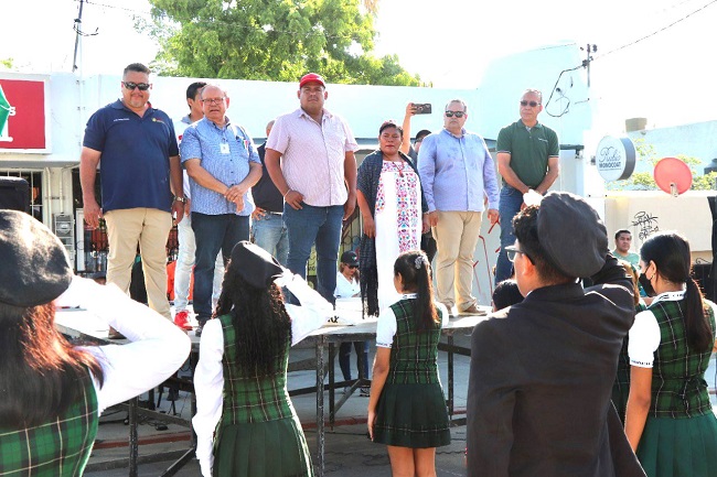 Una vez que concluyó el acto cívico, el delegado Raymundo Zamora Ceseña en compañía de los titulares de las coordinaciones de Contraloría, Educación, Oficialía Mayor, Comunicación Social, Asuntos Jurídicos y la diputada del distrito VIII Eufrocina López Velasco, se trasladaron al templete para presenciar el paso de los contingentes escolares, grupos de emergencia, rescate y seguridad.