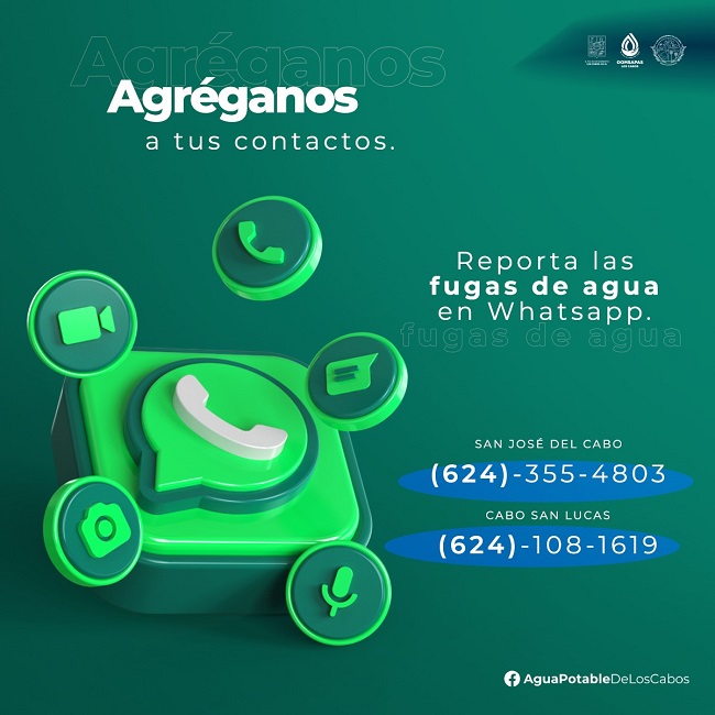 El número para San José del Cabo es el (624) 355 4803 y para Cabo San Lucas el (624) 108 1619; para realizar el reporte solo necesitan guardar los números en sus contactos y enviar un mensaje a través de su aplicación de WhatsApp, con la ubicación, fotografía de la zona y nombre de la persona que reporta para que el equipo de Operación y Mantenimiento llegue al punto exacto.