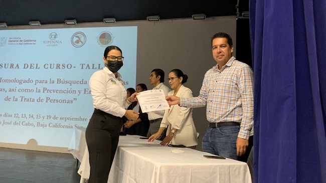 La mañana de este 19 de septiembre se llevó a cabo la clausura del taller denominado “Protocolo Homologado para la Búsqueda de Personas Desaparecidas, así como la Prevención y Erradicación de la Trata de Personas”, en la casa de la cultura Prof. Alfredo Green González; dicho taller fue impartido por la licenciada María Isabel Cruz del Toro en la modalidad de conferencia en línea, los días 12, 13, 14, 15 y 19 de septiembre, esto a través del Sistema de Protección Integral de Niñas, Niños y Adolescentes del Municipio de Los Cabos (SIPINNA).