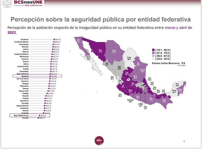 Además, señaló que solamente detrás de Yucatán, el estado se encuentra posicionado como uno de los que cuenta con menor índice en percepción de inseguridad, lo que mantiene a Baja California Sur con los estándares de seguridad favorables, dándole a la ciudadanía tranquilidad y confianza en los cuerpos de salvaguarda y aplicación de justicia.