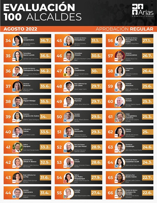 No es casualidad entonces que el alcalde cabeño Oscar Leggs aparezca dentro del top 100 de los alcaldes del país con mejor evaluación en desempeño. En ese sentido, Leggs Castro se ubica según la encuesta de Arias Consultores en el lugar 48 de los 100 alcaldes más importantes de México.