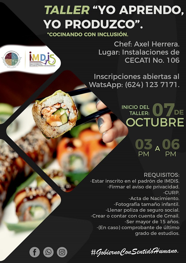 Derivado de las afectaciones que dejaron a su paso las pasadas lluvias, el taller que organiza el Instituto Municipal Para el Desarrollo e Inclusión de Personas con Discapacidad (IMDIS) Los Cabos “Yo Aprendo Yo Produzco” cambió de fecha; ahora se llevará a cabo el 07 de octubre de 3:00 a 6:00 de la tarde en las instalaciones del CECATI No. 106 en San José del Cabo, donde el Chef Axel Herrera enseñará a cocinar con inclusión.
