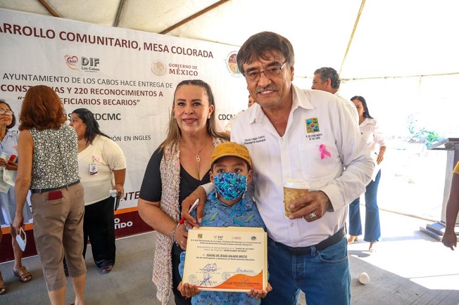 Cumpliendo con el compromiso de dotar a la ciudadanía de herramientas para acceder a nuevas y mejores oportunidades que mejoren la calidad de vida de las familias, el alcalde Oscar Leggs Castro, junto a la presidenta honoraria del DIF Flora Aguilar de Leggs, encabezó la entrega de 108 constancias y 220 reconocimientos a beneficiarios de los cursos y talleres que se imparten de forma gratuita en el Centro de Desarrollo Comunitario de Mesa Colorada en Cabo San Lucas; ahí, Leggs Castro anunció que en breve se estarán poniendo en marcha los Centros de Desarrollo asentados a lo largo de la geografía municipal, a fin de dotar a la ciudadanía de actividades ocupacionales.