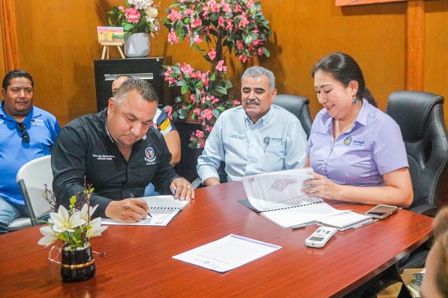“En un ambiente colaborativo y como parte de las acciones conjuntas para la procuración y defensa de los derechos de la base trabajadora, Ayuntamiento de Mulegé y Sindicato de Burócratas formalizamos la firma de las actas donde se instalan la Comisión Mixta de Escalafón y la Comisión de Seguridad e Higiene en beneficio de las y los sindicalizados”, indicó la presidenta municipal.