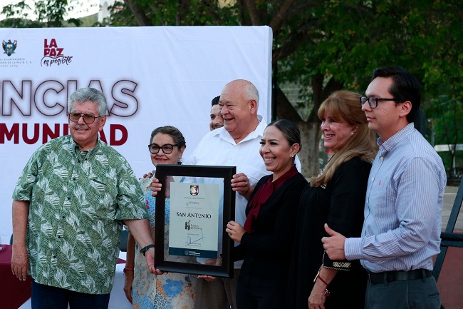 El gobernador Víctor Castro Cosío hizo entrega del nombramiento de “Pueblo Histórico” a la comunidad de San Antonio, en el municipio de La Paz, como una de las acciones para elevar el potencial turístico de los pueblos de Baja California Sur, impulsando su desarrollo económico y el bienestar de las familias