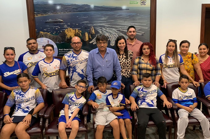 Los Cabos, B.C.S., 20 octubre 2022.- Como parte de la agenda de este jueves, el alcalde Oscar Leggs Castro y el encargado de despacho del Instituto del Deporte del Municipio de Los Cabos Ricardo Hernán Manríquez Castillo, recibieron a integrantes del equipo Charritos de Vista Hermosa, incluyendo a niños y niñas del equipo, así como madres y padres de familia, para solicitar apoyo con transporte y hospedaje para 13 niñas y niños del equipo, así como padres de familia, para asistir a la ciudad de Mazatlán, Sinaloa, a participar en la “Copa Internacional Mazatlán” que organiza el equipo profesional de béisbol Venados de Mazatlán, del 7 al 11 de diciembre.