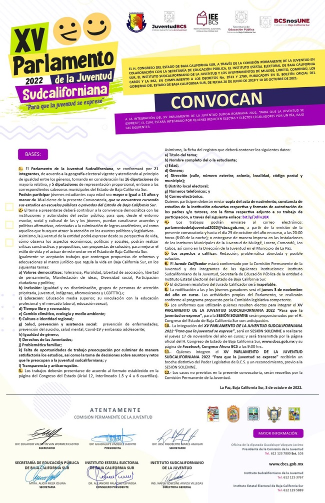 Podrán conocer las bases de la convocatoria a través de las redes sociales del ISJ (@ISJuventudBCS) o mediante la página oficial del Congreso del Estado www.cbcs.gob.mx. Los trabajos deberán enviarse al correo parlamentodelajuventud2022@cbcs.gob.mx