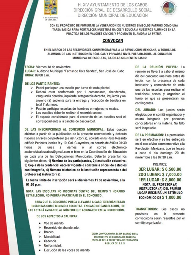 El XIV Ayuntamiento de Los Cabos a través de la Dirección General de Desarrollo Social y la Dirección Municipal de Educación, en el marco de las festividades conmemorativas a la revolución mexicana, invitan a las y los alumnos de las instituciones públicas y privadas de nivel preparatoria al “Concurso Municipal de Escoltas”, que se llevará a cabo el día viernes 18 de noviembre en el auditorio municipal “Fernando Cota Sandez” en San José del Cabo a partir de las 9:00 de la mañana.