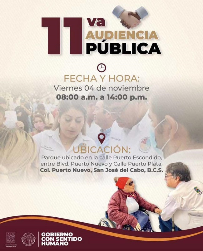 Para refrendar el compromiso de encabezar un Gobierno que brinde una atención directa y cercana a la gente, este viernes 04 de noviembre el XIV Ayuntamiento de Los Cabos que preside el alcalde Oscar Leggs Castro realizará la 11va Audiencia Pública en San José del Cabo.