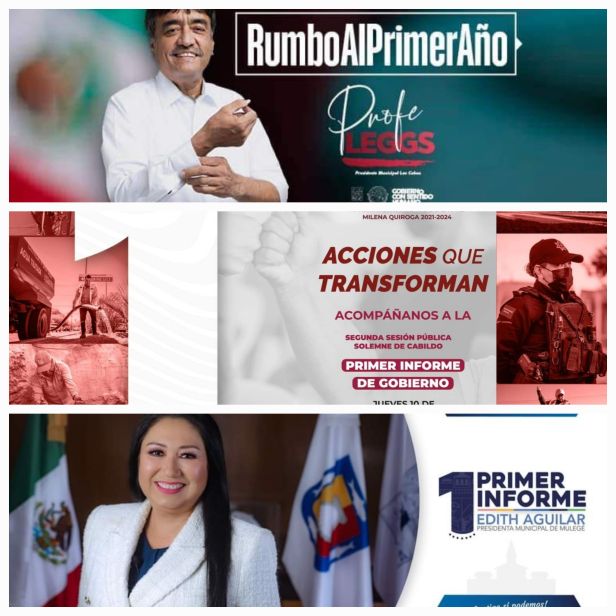 La semana entrante iniciará el ciclo de informes de gobierno de las alcaldesas y el alcalde de los municipios de la entidad. Después de un primer año de gobierno, Edith Aguilar Villavicencio en Mulegé, Paola Cota Davis en Loreto, Liliana Talamantes en Comondú, Milena Quiroga Romero en La Paz y Oscar Leggs Castro en Los Cabos rendirán, de cara al pueblo que les brindó su confianza para dirigir el destino de sus municipios, el informe de sus actividades más relevantes.