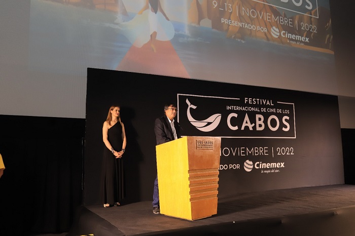 Con una cálida bienvenida a todo el talento artístico y técnico en la industria del cine de México, Estados Unidos de América y Canadá, el presidente municipal de Los Cabos Oscar Leggs Castro, -acompañado por su esposa y presidenta honoraria del SMDIF Flora Aguilar de Leggs-, reconoció la labor de actrices, actores, directores, productores, guionistas, videógrafos y quienes intervinieron en las piezas cinematográficas que participarán en la XI Edición del Festival Internacional de Cine en Los Cabos durante la gala inaugural.