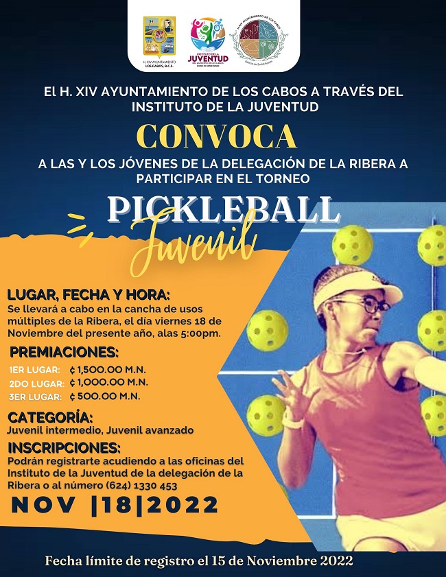 El XIV Ayuntamiento de Los Cabos a través del Instituto de la Juventud, a cargo de Eduardo Gamaliel Valdez Ortiz, convoca a las y los jóvenes de la delegación de La Ribera a participar en el torneo “Pickleball Juvenil”, que se llevará a cabo el viernes 18 de noviembre a las 5:00 de la tarde en la cancha de usos múltiples de La Ribera.