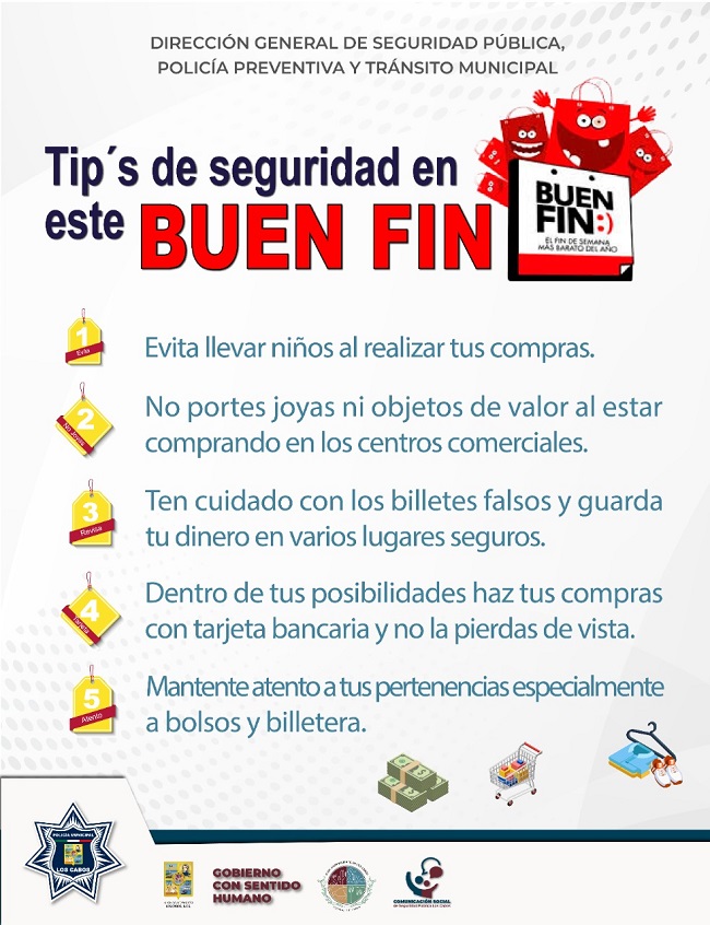 A fin de evitar que la ciudadanía sea víctima de fraudes durante este Buen Fin, la Dirección General de Seguridad Pública, Policía Preventiva y Tránsito Municipal expone algunas recomendaciones para garantizar la seguridad de sus bienes.