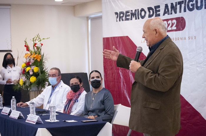 Mediante la suma de voluntades con el personal de salud se realizan esfuerzos en Baja California Sur para fortalecer la calidad de las atenciones médicas que se otorgan a las familias de más bajos recursos, a fin de que puedan conservar o restablecer su bienestar, expresó el gobernador Víctor Castro Cosío al encabezar la entrega de reconocimiento por 20, 25, 30, 35, 40, 45 y 50 años de servicio de trabajadoras y trabajadores de la Secretaría de Salud.