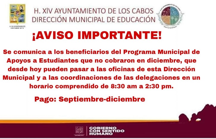 El XIV Ayuntamiento de Los Cabos que preside Oscar Leggs Castro, a través de la Dirección Municipal de Educación a cargo de Jorge Ernesto Servín Meza, hace un llamado a la comunidad estudiantil que aún no pasa a cobrar su “Apoyo Económico a Estudiantes” de los bimestres septiembre-octubre y noviembre-diciembre, a ir a las oficinas en la cabecera municipal y las 4 delegaciones en un horario de 8:30 de la mañana a 2:30 de la tarde, ya que el día 09 de enero es el último día para recibir este recurso.