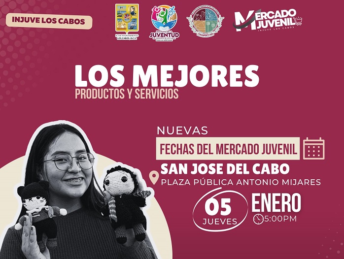 La XIV Administración que preside Oscar Leggs Castro, a través del Instituto de la Juventud del Municipio del Municipio de Los Cabos (INJUVE), a cargo de Eduardo Gamaliel Valdez Ortiz, invita a la ciudadanía a que asistan y participen en el programa “Mercado Juvenil”, que vuelve este jueves 05 de enero en plaza pública Tte. José Antonio Mijares en San José del Cabo a partir de las 5:00 de la tarde y el viernes 06 de enero en plaza Amelia Wilkes de la delegación de Cabo San Lucas a partir de las 7:00 de la tarde.
