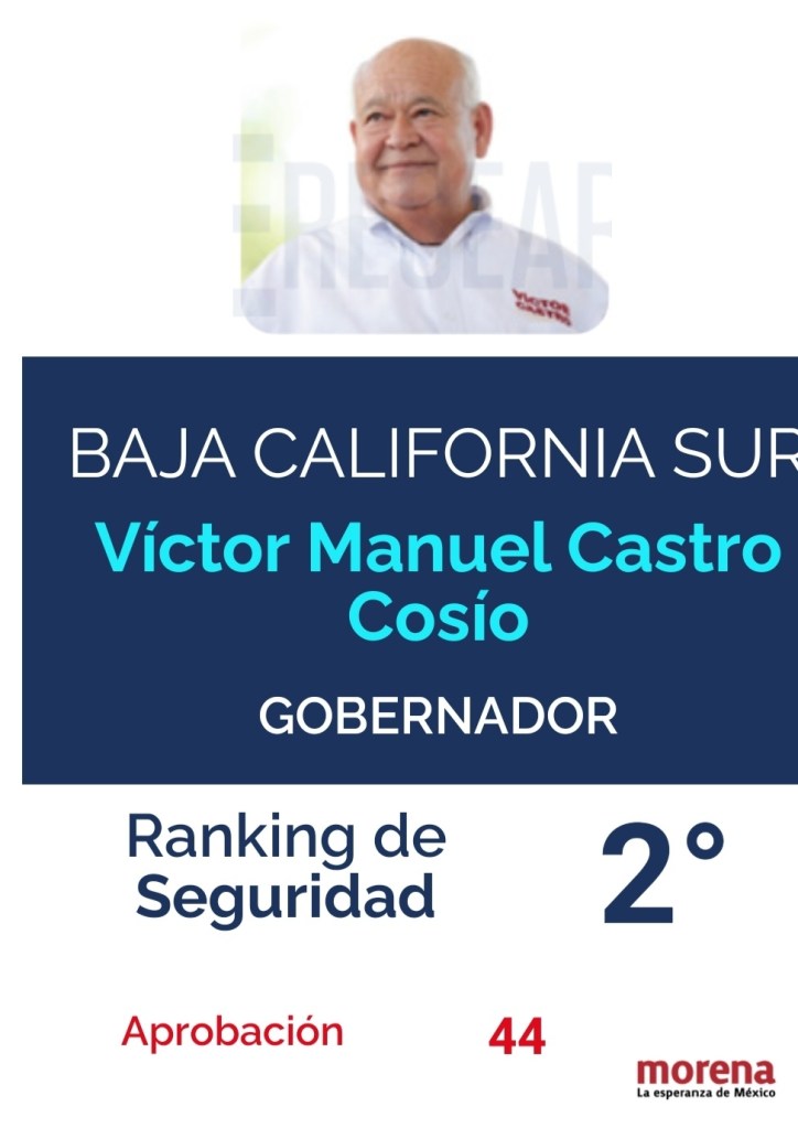 Lo anterior se ve reflejado en la percepción ciudadana que en las encuestas de inicio de año colocan al primer mandatario del estado Prof. Víctor Castro Cosío dentro de los primeros diez gobernadores con mejor desempeño y, en el tema de Seguridad, un segundo lugar de aprobación por parte de la población del Baja California Sur, según los datos publicados por la casa encuestadora CE Research en su Ranking de Gobernadores de México.
